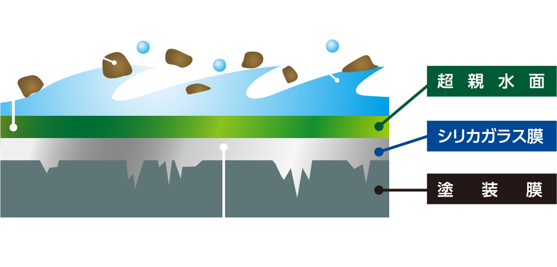 対水接触角が10度以下(一般的なコーティングの対水接触角は30度程度)の超親水表面を形成するので、コーティング表面にかかった水は水滴にならずに拡散し、汚れの下に入り込んで浮き上がらせ、自然に洗い流してしまいます。この自浄効果を、セルフクリーニング効果といいます。