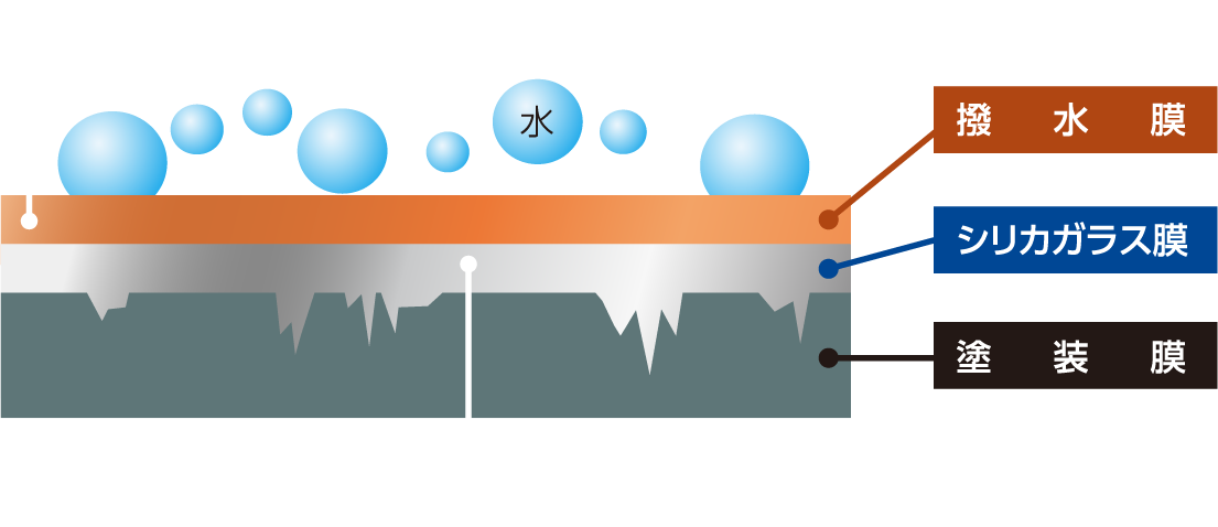 硬く、平滑な無機シリカガラス(SiO2)膜がブレーキダストなど、汚れの吸着を抑えます。